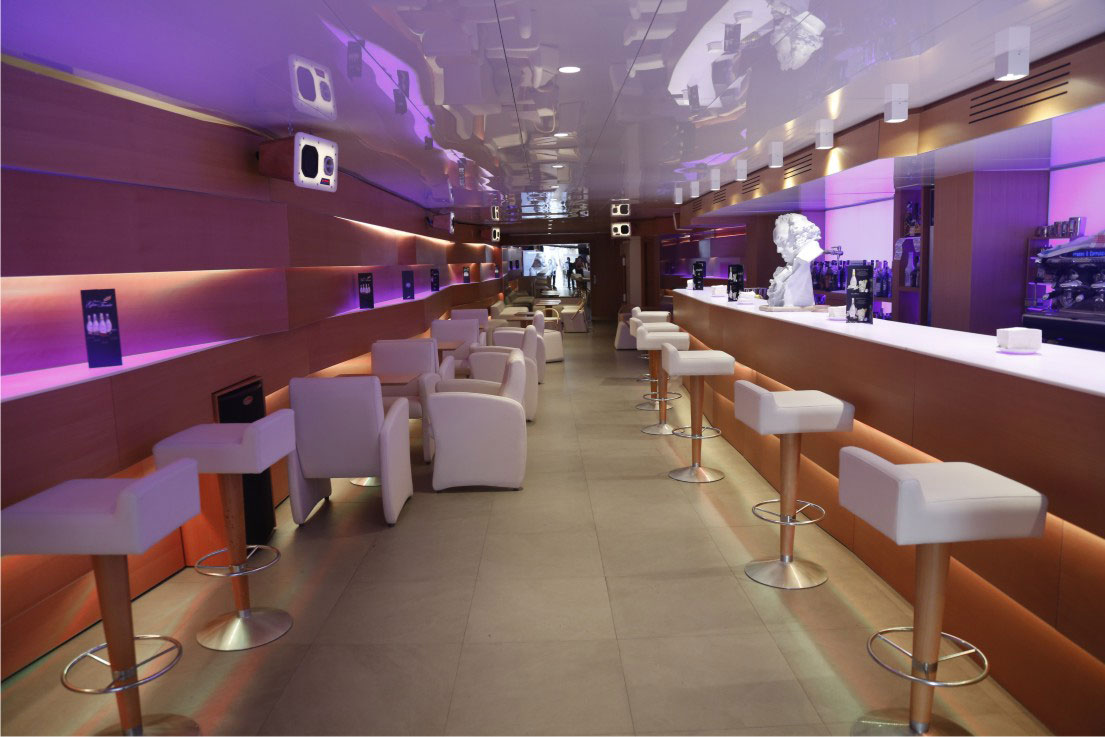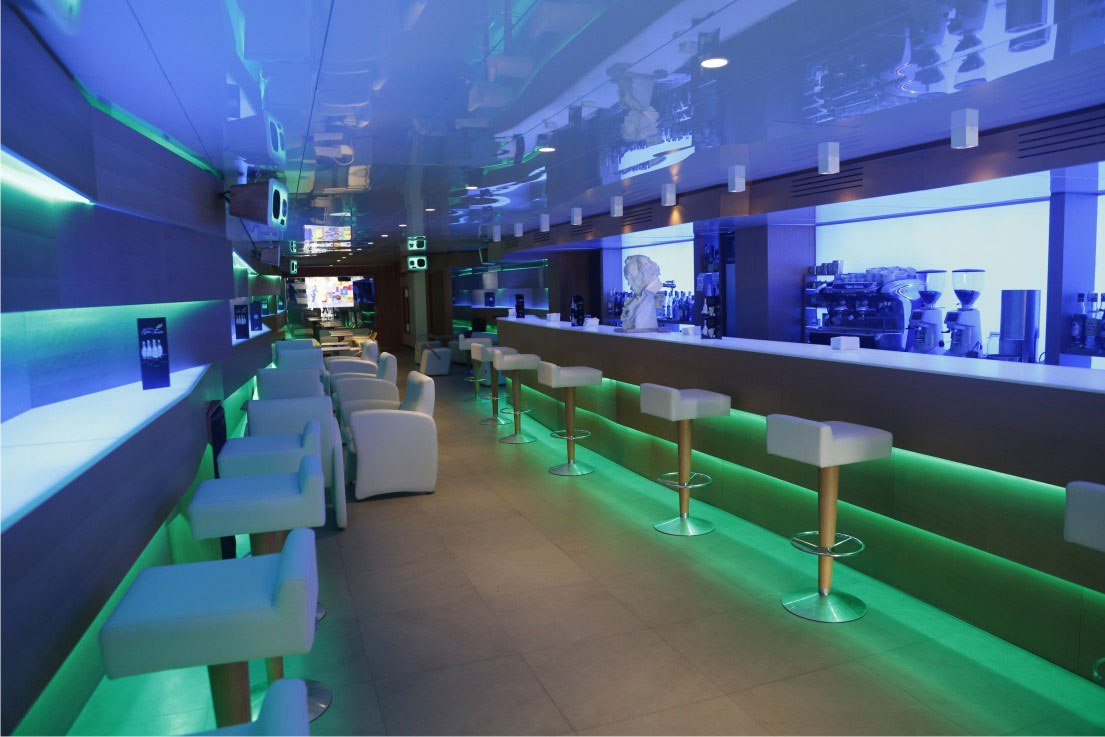 Lugar agradable para un café Iluminación con verdes-azulados juego de luces e el local cafetería Goya Acompañamiento de luces agradables para un buen café relajante atmosfera para un buen café cafetería Goya, un lugar diseñado para tomar un café con las amistades Con esta iluminación, la cafetería Goya luce con elegancia El busto del famoso pintor Goya en la barra de la cafetería con su nombre