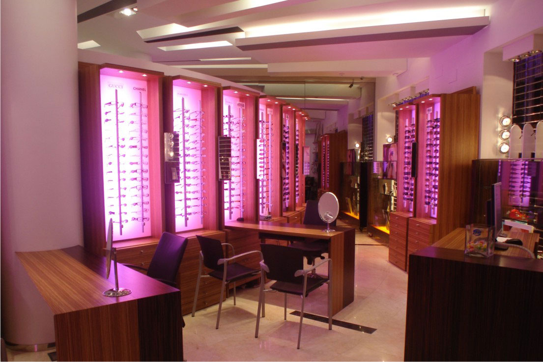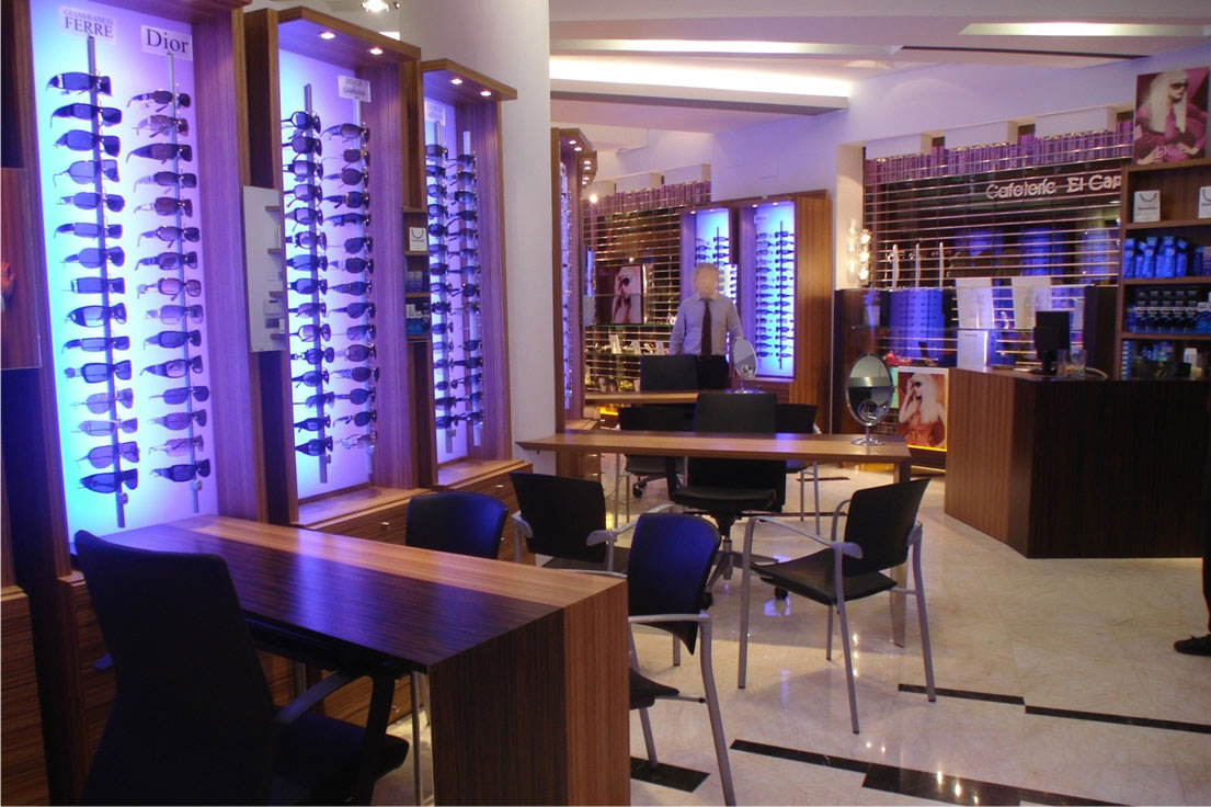 Diseño de fachada óptica Vista de los espositores de una óptica